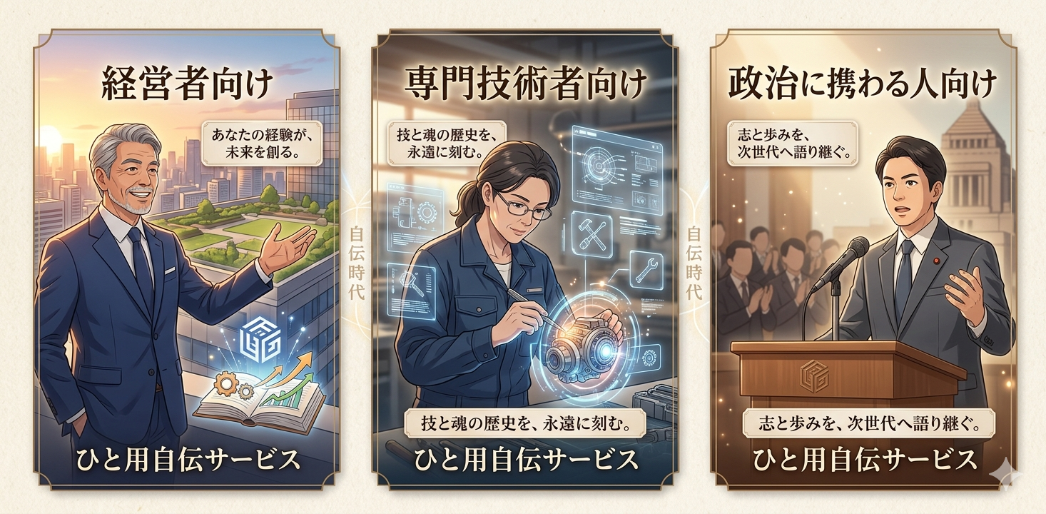 | 経営者様の生き様を端的に | 創業の苦労から成功の軌跡、そして未来へ託すビジョンを。あなたの経営哲学を組織の資産として残します。また、政治に携わる方や、教育者としての哲学、姿勢等を表現できます。 |